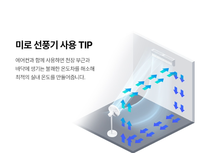 미로 바람이지는 좌우 120도, 수직 3D 회전이 가능해요. 이 말은 바람이 닿지 않는 사각지대가 거의 없다는 뜻이죠! 방 구석구석 시원한 바람이 닿아 실내 온도를 균일하게 유지해줘요.
