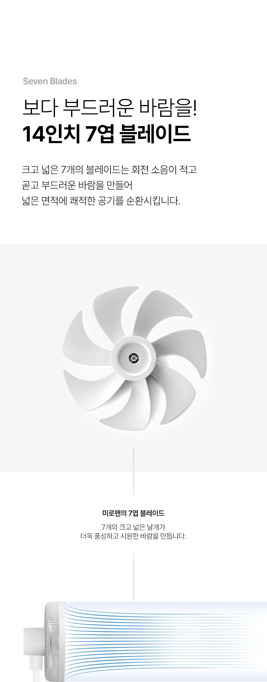 미로 바람이지 선풍기의 또 다른 특별한 점은 바로 '7엽 블레이드'에요. 대부분의 일반 선풍기는 3~4개의 날개를 가지고 있는데, 미로 바람이지는 무려 7개의 날개를 가지고 있어요. 게다가 14인치의 넓은 날개 면적!